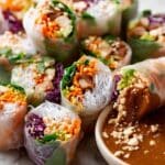 - Serve: Transfer rolls to a serving plate (avoid stacking to prevent sticking). Optionally, cut rolls in half and stand upright for presentation. Serve immediately with the prepared peanut dipping sauce.