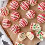 These festive Little Debbie Christmas Tree Cake Balls are a delightful holiday treat combining creamy cream cheese and Little Debbie vanilla Christmas tree snack cakes, all coated in smooth white chocolate and decorated with red candy drizzle and green sanding sugar for a beautiful, bite-sized dessert perfect for holiday gatherings.