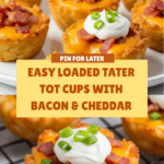 Loaded Tater Tot Cups are a fun and delicious twist on a classic snack, perfect for parties or a comforting appetizer. Crispy on the outside and filled with melty cheese and bacon, they’re sure to be a crowd-pleaser.