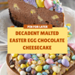 This Malted Easter Egg Chocolate Cheesecake is a rich and creamy dessert combining a smooth chocolate cream cheese filling with crunchy malted Easter eggs. The Oreo cookie crust adds a perfect buttery base, while the chocolate whipped cream topping enhances the decadent flavors. Baked in a water bath, this cheesecake is velvety and crack-free, perfect for Easter celebrations or any chocolate lover’s treat.