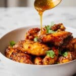 A white shallow bowl filled with multiple golden-brown, crispy chicken wings, each wing showing a textured, spicy glaze. Small green cilantro leaves are scattered on top, adding a fresh contrast to the warm colors of the wings. Above the bowl, a golden spoon held by a woman's hand is pouring a shiny, amber-colored sauce over the wings, creating a glossy layer on the surface of the chicken. The background shows a soft white marbled texture. photo taken with an iphone --ar 4:5 --v 7