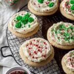 The image shows several round cookies arranged on a black cooling rack on a white marbled surface. Each cookie has a golden-brown base with a rough edge and a thick layer of creamy white frosting spread on top. The frosting is decorated with colorful sprinkles in green tree shapes, red and green dots, and red, white, and green small cylinders. A closed white container of green and red sprinkles and a piece of white cloth are visible in the background. The wood texture of the table contrasts with the white marbled surface around it. photo taken with an iphone --ar 4:5 --v 7