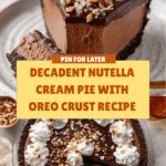 This luscious Nutella Cream Pie features a crunchy Oreo cookie crust, a rich and creamy Nutella-infused filling, and a smooth hazelnut ganache topping. Finished with toasted hazelnuts, flaky sea salt, and optional whipped cream, this no-bake dessert is perfect for any chocolate and hazelnut lover seeking an indulgent yet easy-to-prepare treat.