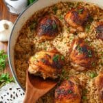 Using an oven-safe skillet is best since it allows you to cook on the stovetop and then transfer directly to the oven. If you don’t have one, you can transfer the rice and onion mixture to a baking dish, place the seared chicken on top, and bake as directed.