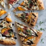 This Peach Burrata Balsamic Dessert Pizza combines a perfectly risen homemade dough topped with caramelized peaches, creamy burrata cheese, fresh thyme, and a tangy balsamic glaze for a decadent and unique dessert pizza experience.