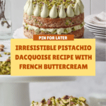Keywords: Pistachio Dacquoise, French dessert, meringue cake, pistachio buttercream, elegant cake, nutty cake