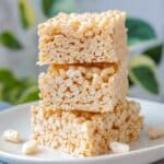 A close-up of a stack of three square Rice Krispies treats with visible puffed rice pieces and a glossy, slightly sticky texture. The bottom two layers are tightly packed with a light golden-beige color, while the top layer looks puffier and lighter with more visible individual rice pieces. A few small puffed rice pieces are scattered on the white plate below the stack. The background is softly blurred with green leaves and a soft white marbled texture. photo taken with an iphone --ar 4:5 --v 7