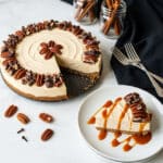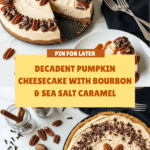 Keywords: pumpkin cheesecake, bourbon cheesecake, sea salt caramel, fall dessert, holiday dessert, spiced pumpkin, creamy cheesecake