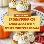This luscious Pumpkin Cheesecake combines a spiced pumpkin-flavored cream cheese filling with a buttery graham cracker crust, baked in a water bath for a smooth, crack-free texture. Topped with a cinnamon-spiced cream cheese whipped cream and chopped pecans, this dessert is the perfect cozy treat for fall or any festive occasion.
