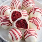 These Red Velvet Cake Balls combine the rich, moist flavor of red velvet cake with a smooth cream cheese center, all coated in a silky white almond bark and optionally decorated with red candy melt stripes for a festive and delicious treat perfect for parties and celebrations.