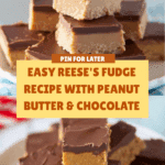 Keywords: Reese’s fudge, peanut butter fudge, chocolate peanut butter dessert, no bake fudge, easy fudge recipe