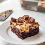 Keywords: Reese’s Peanut Butter Cup Cake, peanut butter cake, chocolate swirl cake, devil’s food cake, peanut butter frosting, easy dessert, chocolate peanut butter dessert
