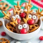 These adorable Reindeer Pretzels are a festive and fun holiday treat made with melted Rolos, mini pretzels, red chocolate candy noses, and candy eyes. Ready in just minutes, they are perfect for Christmas parties or a sweet snack during the holiday season.