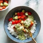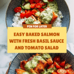 This salmon with basil sauce and tomato salad is a fresh and flavorful meal that’s easy to prepare. The combination of tender baked salmon, creamy herb sauce, and a vibrant salad makes for a perfect weeknight dinner or casual gathering.