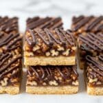 The image shows a close-up of several square pecan bars stacked on top of one another. Each bar has two visible layers: the bottom crust layer is golden brown and firm, while the top layer is a sticky, glossy pecan filling with bits of small pecan pieces embedded inside. The top surface of each bar is decorated with a thick dark chocolate drizzle in a zigzag pattern. The bars are placed closely together on a cream-colored parchment paper, and the background has a soft white marbled texture. photo taken with an iphone --ar 4:5 --v 7