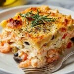 This comforting Seafood Lasagna combines succulent shrimp and scallops with creamy ricotta, mozzarella, and Parmesan cheeses layered between tender lasagna noodles and rich marinara sauce. Baked to golden perfection, it’s a delightful twist on a classic Italian favorite that’s perfect for seafood lovers.