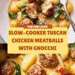 This Slow-Cooker Tuscan Chicken Meatballs with Gnocchi is a comforting and flavorful dish that’s perfect for busy weeknights. Tender chicken meatballs simmer in a rich tomato and wine sauce alongside pillowy gnocchi and fresh spinach, creating a hearty meal with minimal effort.