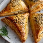 These Spinach and Feta Triangles are a delicious savory pastry featuring a flavorful filling of fresh spinach, creamy ricotta, tangy Greek feta, and fresh herbs, all encased in flaky puff pastry. Perfect as an appetizer, snack, or light meal, these golden-baked triangles pair wonderfully with lemon wedges and fresh dill for a bright, fresh finish.