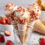 - Fill and Garnish the Cones: Fit a large piping bag with a wide tip and fill it with the cheesecake mixture. Pipe about ⅔ cup of filling into each hardened decorated waffle cone, shaping it to resemble ice cream. Top each cone with reserved strawberry crunch and a few diced fresh strawberries for garnish.