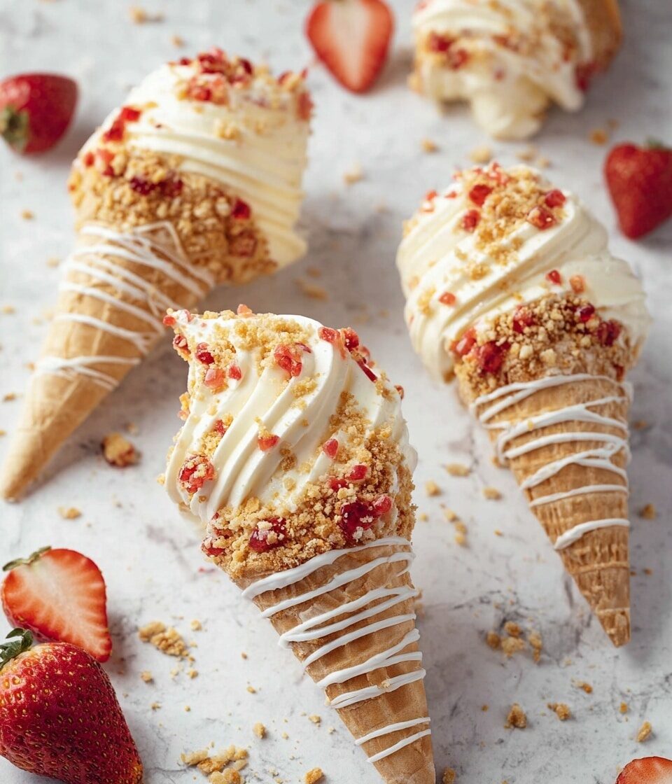 Strawberry Crunch Cheesecake Cones offer a delightful combination of creamy cheesecake, crunchy cookie goodness, and fresh strawberries all nestled in a crisp waffle cone. This fun and elegant treat is perfect for parties or a special dessert that feels both whimsical and indulgent.