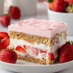 Strawberry Eclair Cake is a no-bake layered dessert featuring creamy cheesecake-flavored pudding, fresh strawberries, and graham crackers, topped with sweet strawberry frosting. It’s a simple and delicious treat that requires no baking and is perfect for parties or a refreshing summer dessert.