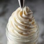 A clear glass jar filled with creamy white frosting swirled in three distinct layers, each layer having a smooth, soft texture with visible piping ridges, and a large swirl on top that peaks in the center. The jar is placed on a white marbled textured surface with a dark blurred background, highlighting the smooth, fluffy, and light consistency of the frosting. photo taken with an iphone --ar 4:5 --v 7