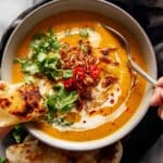 - Serve: Ladle the soup into bowls and top with crispy Asian shallots, sliced red cayenne pepper, and fresh coriander leaves. Serve with pan-fried roti on the side for dunking and extra flavor. Enjoy!