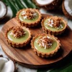 These Thai Pandan Coconut Tarts combine a crisp, buttery pastry with a fragrant pandan and coconut custard filling, topped with toasted coconut flakes for a delightful tropical flavor in every bite.