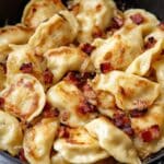 Classic Polish pierogi made with a creamy potato and cheddar cheese filling encased in a tender homemade dough. These traditional dumplings are boiled until tender and then pan-fried with golden sautéed onions for a rich, savory finish. Perfect as a comforting main dish or appetizer.