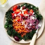 - Assemble and serve: Plate a generous portion of the massaged kale. Top with a serving of the tomato fried rice. Garnish with thinly sliced 1/2 small red onion, 1/4 cup chopped olives, and crumbled feta cheese to taste. Serve immediately for a delicious and balanced meal.