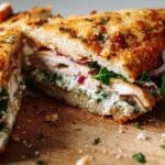 A delicious and easy-to-make sandwich featuring Trader Joe’s sun-dried tomato focaccia bread layered with deli turkey, fresh tomato slices, greens, red onion, and a flavorful pesto mayo spread. Perfectly toasted for a warm, savory experience, this sandwich is ideal for lunch or a quick meal.