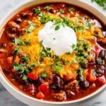 - Serve and garnish: Spoon the chili into bowls and top each serving with shredded cheddar cheese, a dollop of sour cream, and fresh cilantro for a delicious finish.