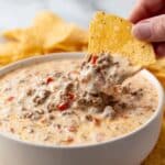 Keywords: Velveeta dip, Rotel dip, cheesy dip, party appetizer, ground beef dip, game day recipe, easy dip
