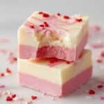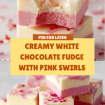 This White Chocolate Fudge recipe features two luscious layers of creamy white chocolate, one tinted with pink food coloring and the other pure white, beautifully swirled together and topped with heart-shaped sprinkles. It’s a no-bake, simple treat perfect for special occasions or a sweet indulgence.