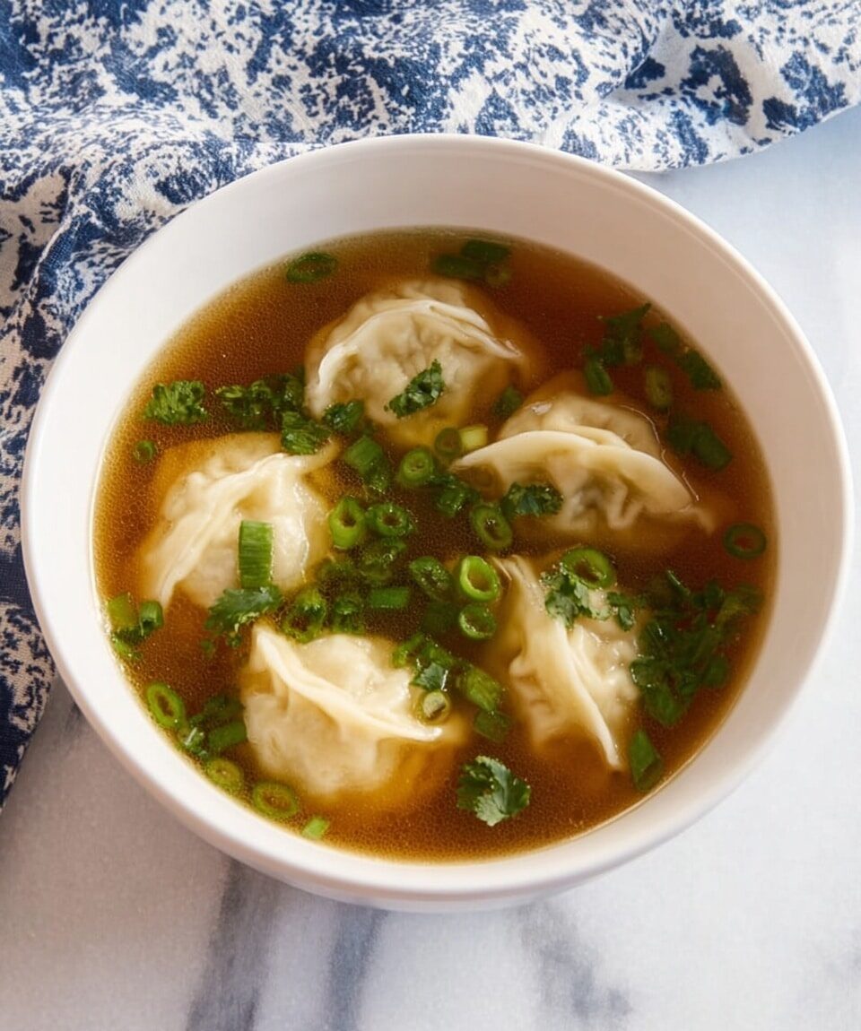This comforting Wonton Soup recipe features delicate frozen wontons simmered in a flavorful broth infused with garlic, ginger, soy sauce, and sesame oil. Topped with fresh green onions and cilantro, it’s an easy-to-make, warming dish perfect for any day.